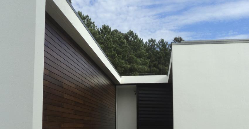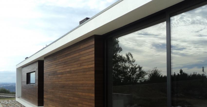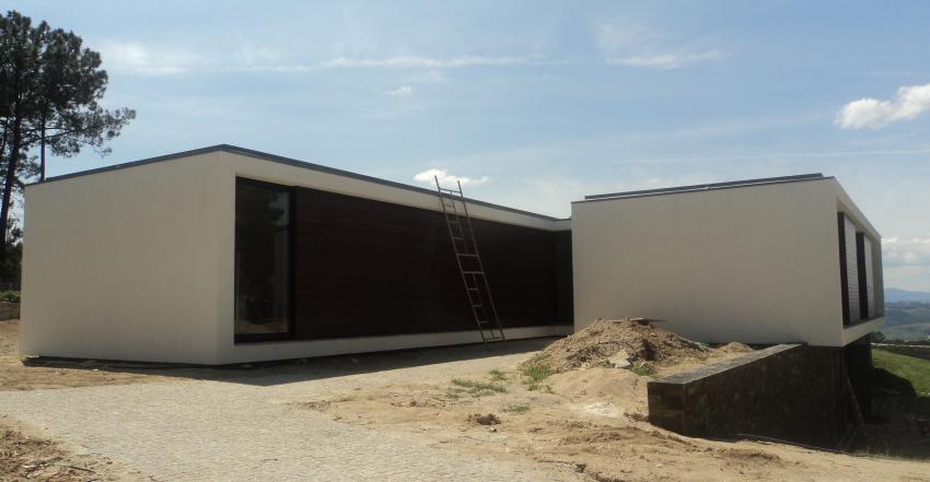 A volumetria da habitação fragmentou-se em duas unidades espaciais autónomas (zona privada/zona pública), que ficaram interligadas por um hall distribuitivo, simultaneamente conector das várias funções internas do programa. Os subvolumes referidos pousaram sobre o terreno terraplanado à cota de entrada de modo a potencializar o seu carácter arquitectónico, e, deste modo, usufruírem da excepcional relação com o território envolvente e fazendo com que a pendente natural do terreno nos permita a acessibilidade a uma garagem a nível inferior. A zona privada da habitação voltou-se para o interior do terreno usufruindo de maior privacidade e de maior incidência solar, proporcionando assim espaços de lazer com maior solarização e relação com a natureza.