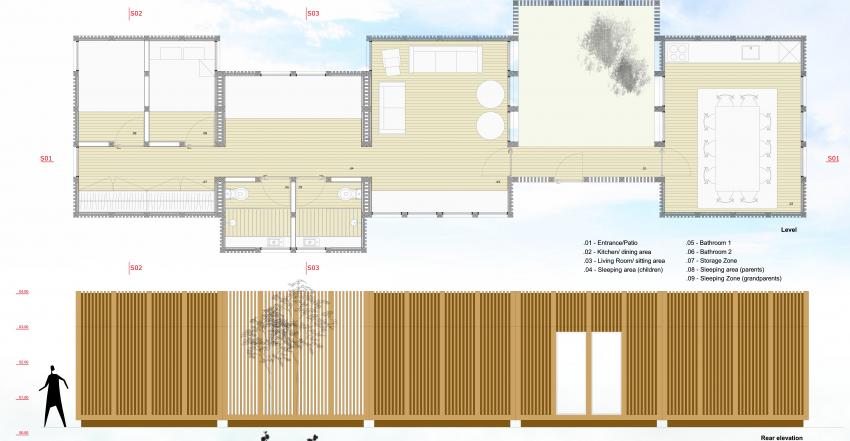 The spatial organization is divided into zones: the Patio, the dining area and food preparation, living / leisure, sleep (children, parents and grandparents) and storage area.