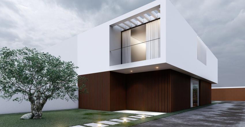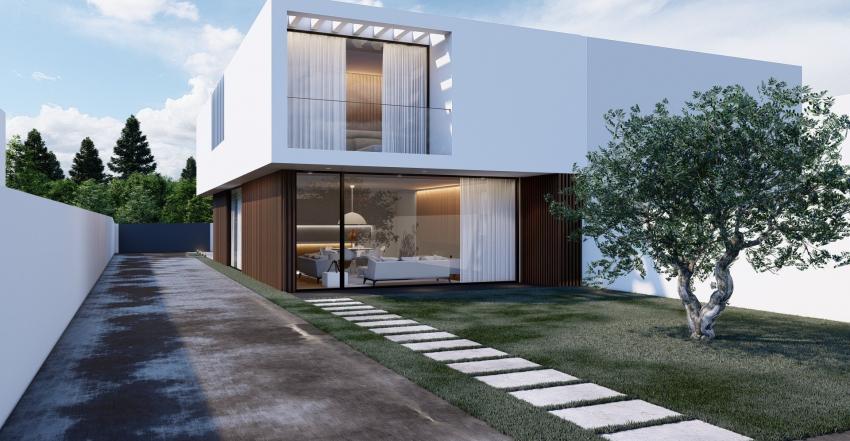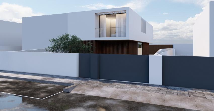 No piso superior optou-se também pela uniformização do volume utilizando um revestimento continuo em capoto branco, que pousará sobre o volume inferior. Este volume superior é quebrado nas zonas de quartos gerando espaços de varandas/terraços. Contudo, para que estas quebras não se evidenciem para lá do necessário e para que se pudesse garantir uma continuidade volumétrica, propõe-se a criação de elementos estruturais, tipo pérgulas, que encontram o ponto de equilíbrio entre a ideia da interrupção sem perda da continuidade volumétrica.